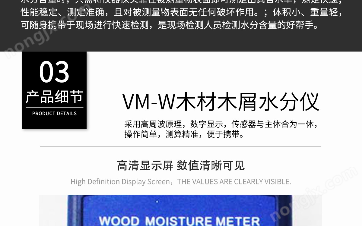 1、VM-W木材水分测定仪,采用高周波原理,液晶数字显示,探头与主机合为一体。