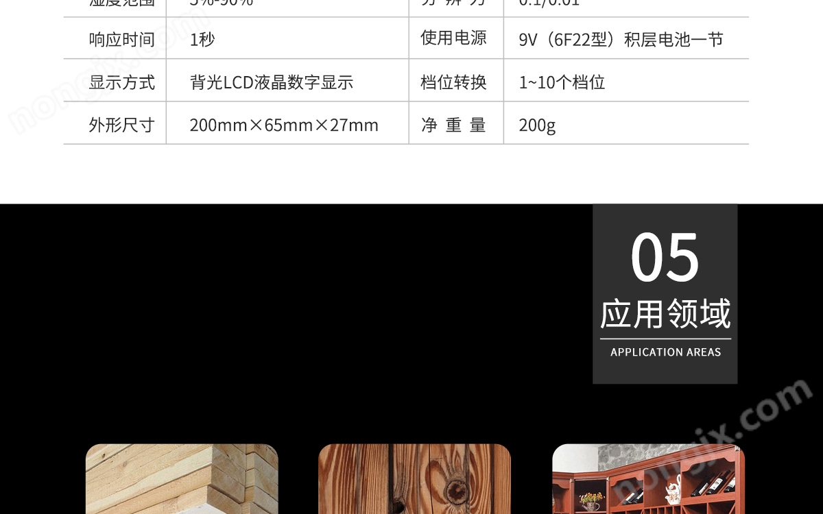 维科美拓牌VM-W型木材水分测试仪广泛应用于各种木材、木板、家具等水分的测定,无需在木材表面或内部穿孔,只需将仪器传感探头轻压在木材表面,1秒钟过后数值稳定,即为木材水分含量。