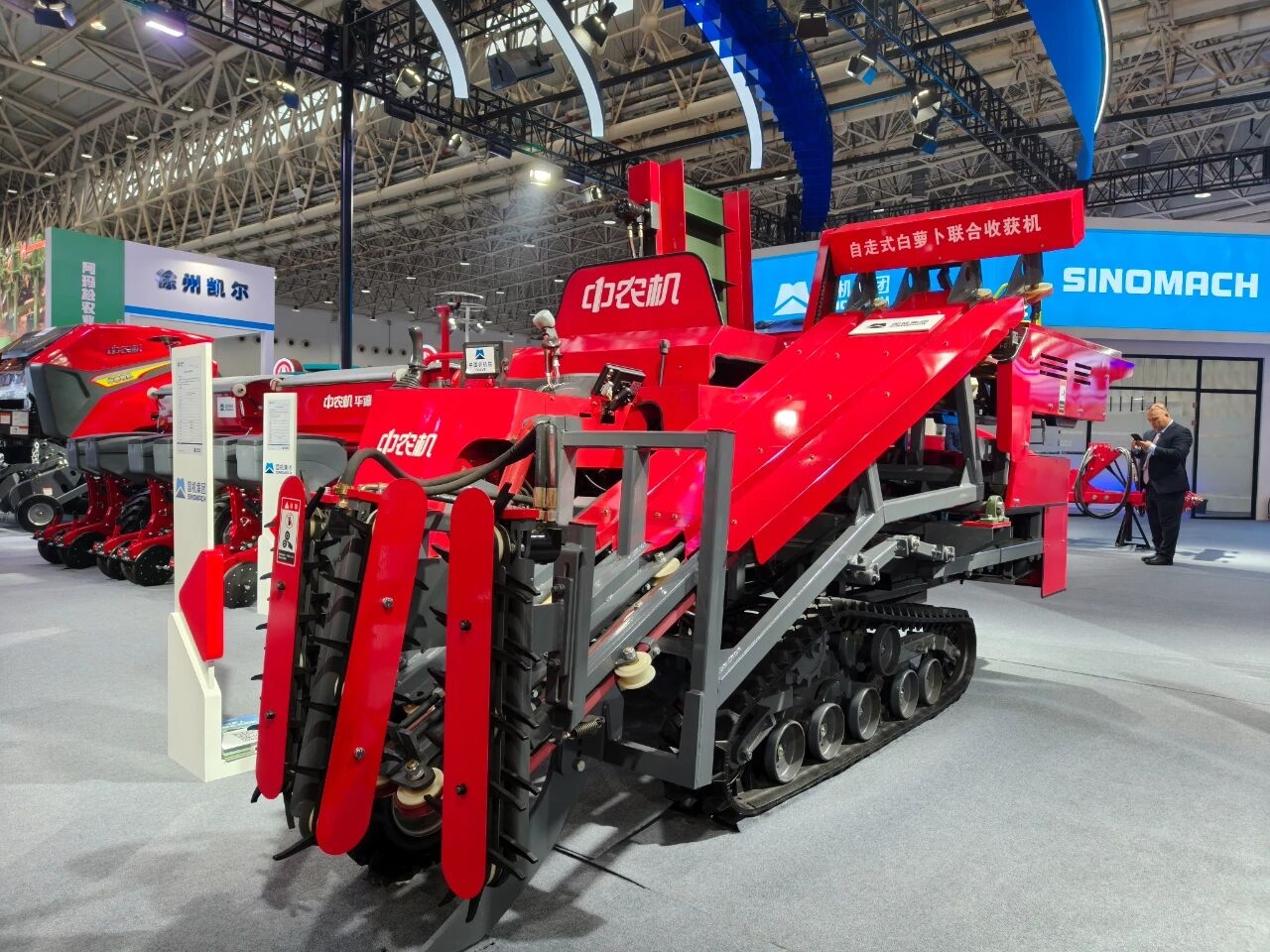 近年来,中国农机院陆续攻克萝卜、白菜等果蔬收获技术与装备,本次展会展出的白萝卜收获机针对我国白萝卜小垄单行及大垄双行种植模式,适用行距22~40厘米可调,垄距70~90厘米(双行)、35~45厘米(单行)的种植作业场景,具备一次性完成挖掘、夹持、输送、切缨、升运(或铺放)等功能,可高效完成白萝卜联合收获。