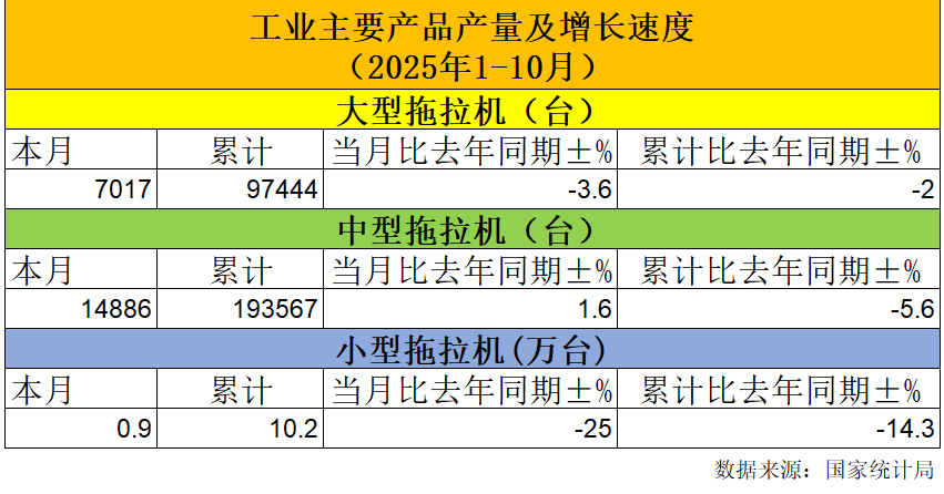 2025年1-10:我国大、中、小型拖拉机累计产量较去年均下滑