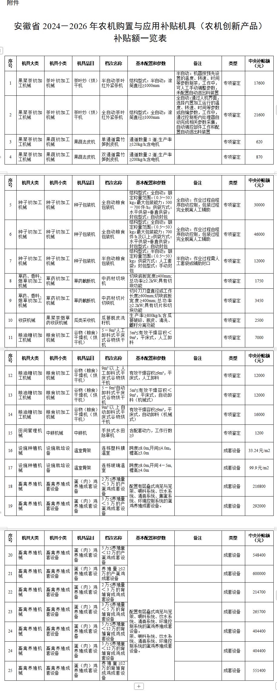 安徽省2024-2026年农机购置与应用补贴机具(农机创新产品)补贴额公示