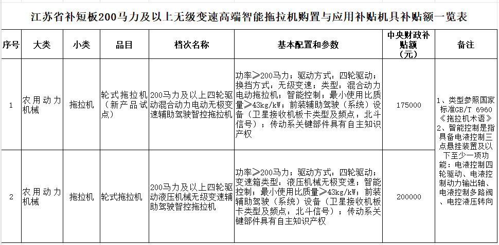 按江苏省印发江苏省补短板200马力及以上无级变速高端智能拖拉机购置与应用补贴机具补贴额一览表(苏农机〔2025〕7号)执行(见下表)。根据列补产品市场价格变化情况,适时调整补贴额。